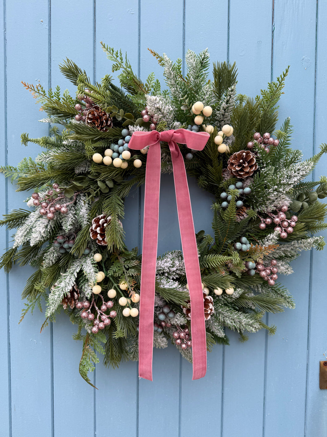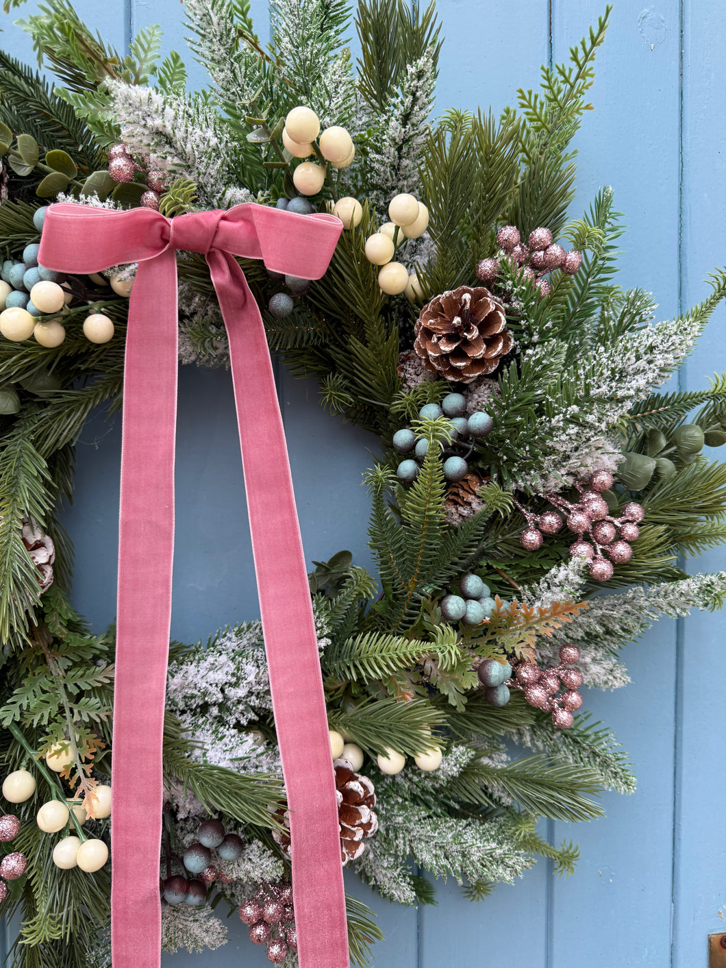 Introducing Astrid, the Christmas wreath designed to bring soft elegance and modern charm to your home. This beautiful piece combines frosted foliage crafted from premium silk and artificial materials, adorned with romantic dusk pink tones and blueberries that create a sophisticated colour palette. Natural pine cones add rustic texture and warmth, whilst a delicate pink velvet ribbon provides an elegant finishing touch. Whether displayed at your entrance or throughout your interior spaces, Astrid adapts seamlessly to any setting. Built to endure outdoor conditions whilst maintaining its refined, graceful appearance, this wreath delivers reliable festive beauty that supports your vision for a truly special season.