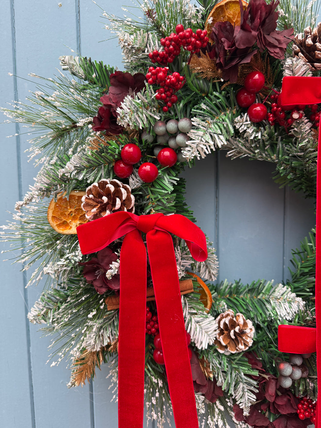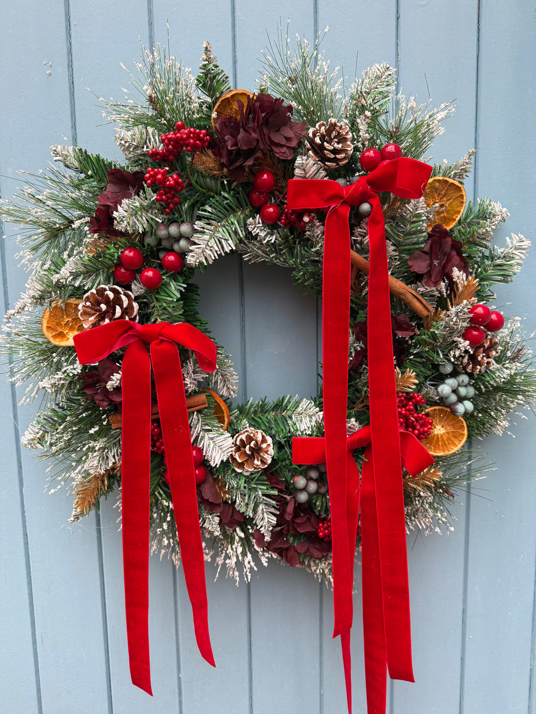 Introducing Dolly, a stunning Christmas wreath that brings festive elegance to any space. Crafted with premium silk and artificial materials, this wreath features a beautiful blend of natural pine cones, vibrant red berries, and blueberries nestled among burgundy flowers. Delicate gold accents add a touch of luxury, while a luxurious red velvet ribbon completes the look. Designed for both indoor and outdoor display, Dolly is the perfect way to celebrate the season with style and sophistication.