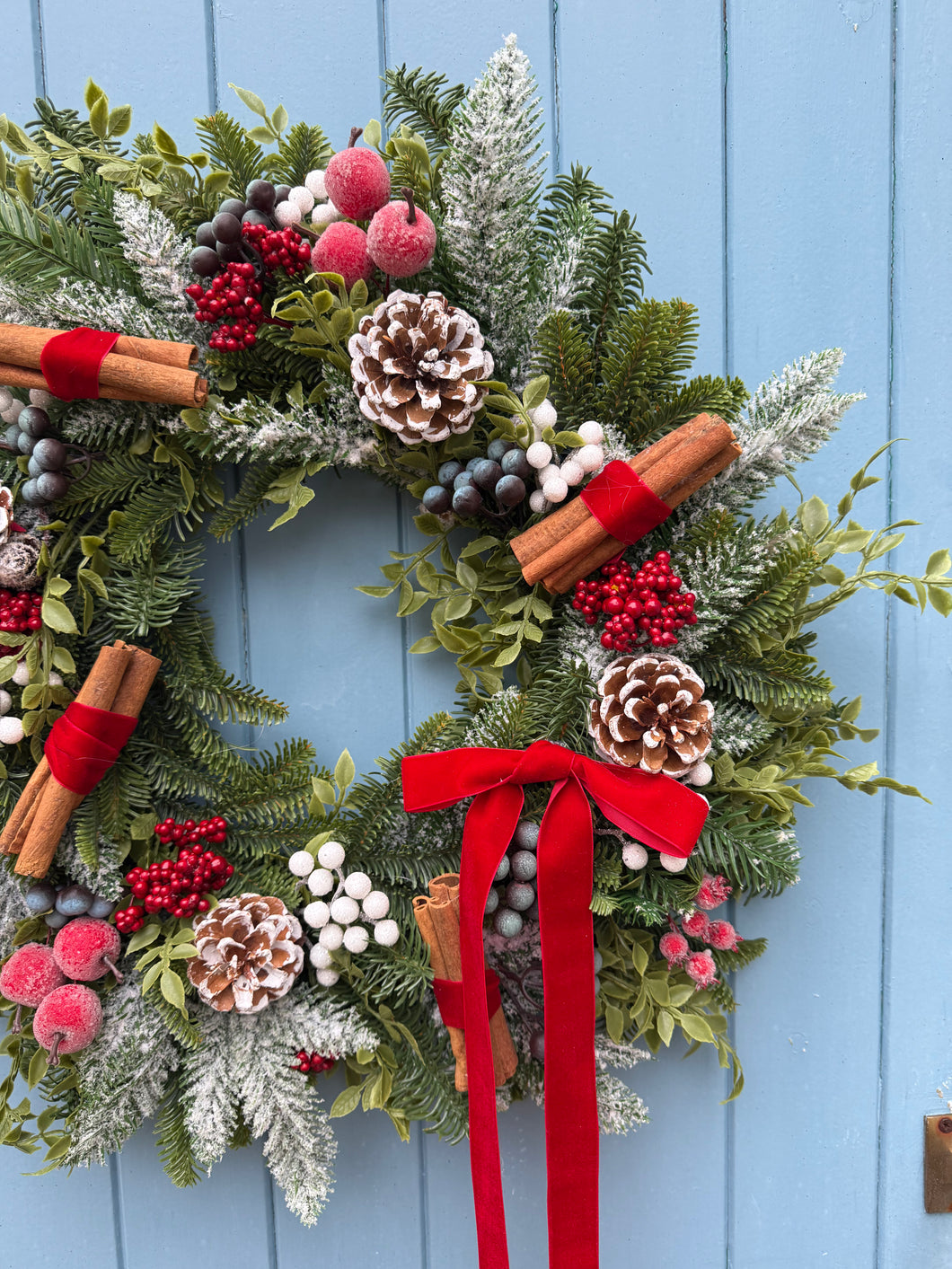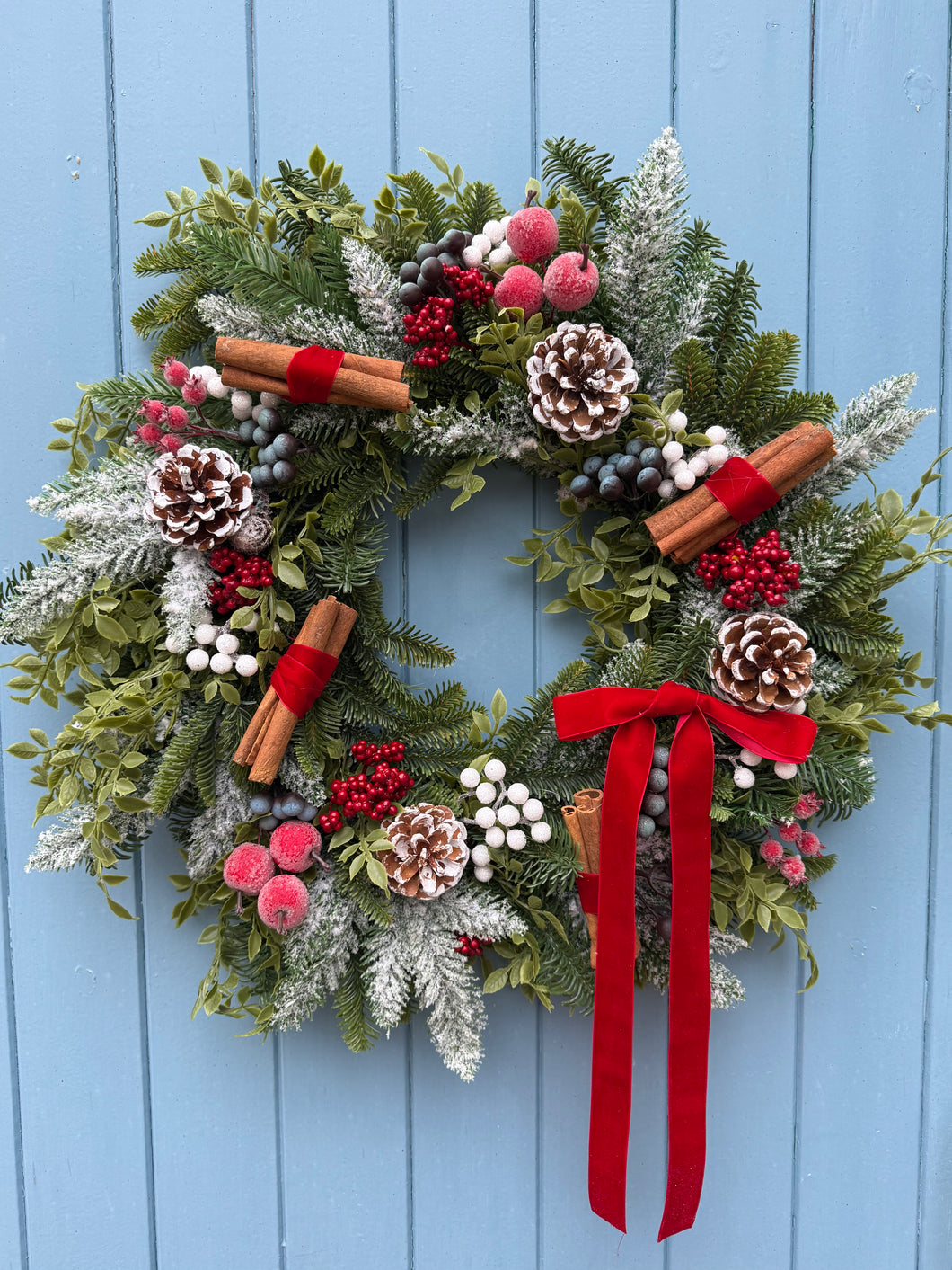 Meet Ginny, the Christmas wreath crafted to bring festive joy to your home. This stunning piece combines shimmering frosted foliage with a vibrant medley of berries and fruit that create visual warmth and dimension. Natural pine cones add authentic woodland character, all beautifully finished with a sophisticated red velvet bow. Ginny adapts effortlessly to any setting, whether adorning your doorway or enhancing interior spaces. Built to endure outdoor elements whilst retaining its elegant appeal, this wreath delivers consistent holiday beauty and charm throughout the season