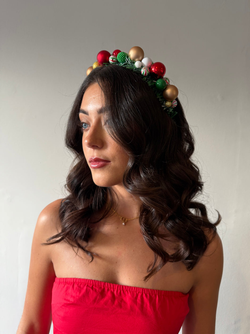 Get ready to spread some festive cheer with Angeline! This headband is adorned with Christmas baubles and a dash of sparkle, perfect for adding Christmas vibes to any outfit. With a soft base, you can rock this accessory all season long.
