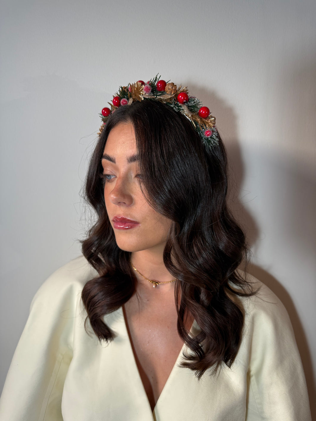Featuring mini pine cones, berries, and champagne glitter leaves, this classic band will add a touch of christmas cheer to any outfit.